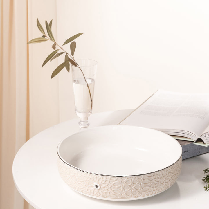 The salad serving bowl features a luxurious design inspired by traditional Arabic patterns, giving it an elegant and heritage-rich character. Made from high-quality porcelain, it boasts a polished finish that complements various table styles. The sides are adorned with intricate raised patterns, harmoniously interwoven to give the bowl an artistic touch, adding beauty and elegance to every meal served.